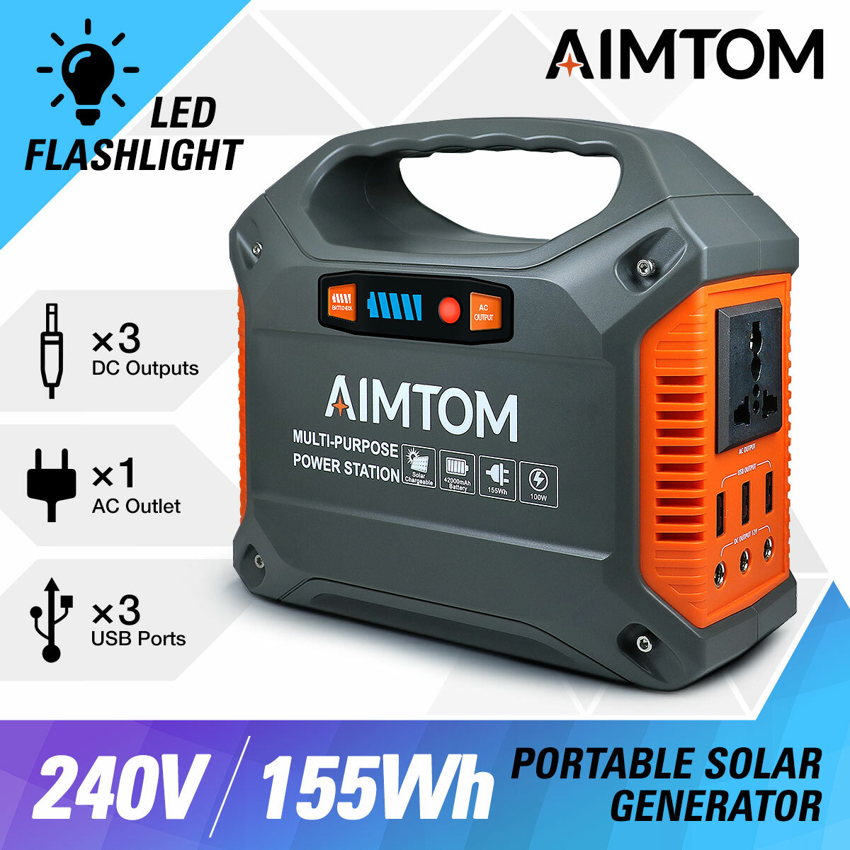 Aimtom portable solar generator 42000mah 155wh power station emergency backup power supply w flashlights for camping home cpap travel outdoor 240v 100w ac outlet 3x 12v dc 3x usb output.